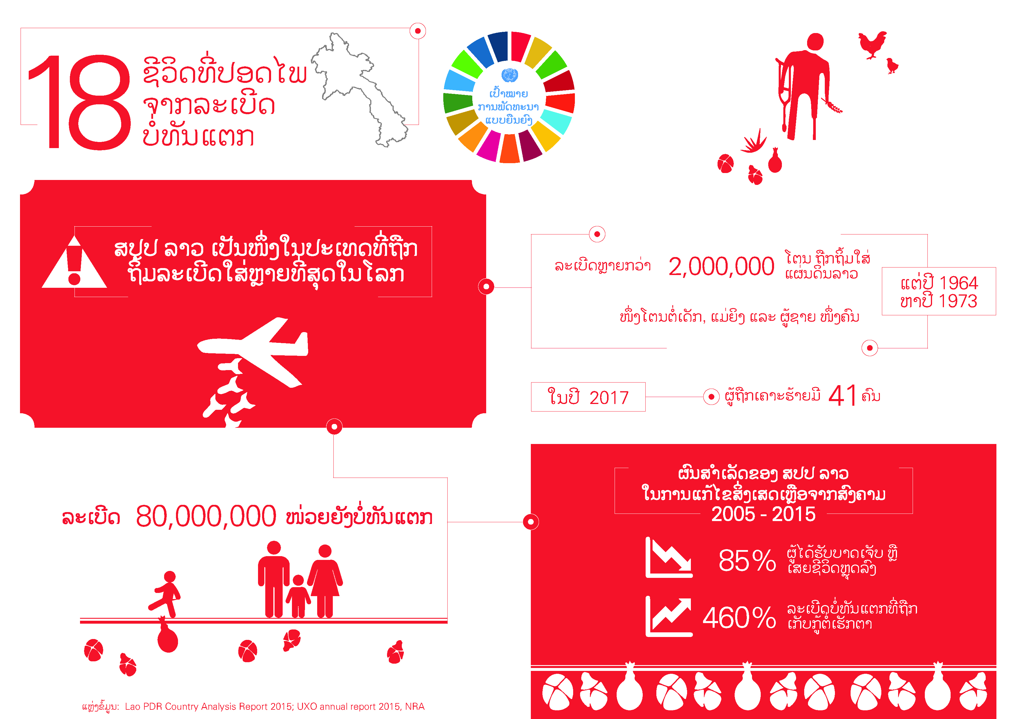 ປະເທດລາວໄດ້ມີການພັດທະນາ “ເສັ້ນທາງກ້Tagsາວສູ່ຄວາມຫອດໄພ II” ເຊິ່ງເປັນແຜນຍຸດທະສາດແຫ່ງຊາດແນໃສ່ຫຼຸດຜ່ອນຜົນກະທົບຈາກ ລບຕ. ເປົ້າໝາຍຂອງແຜນດັ່ງກ່າວແມ່ນຈັດໃຫ້ສອດຄ່ອງກັບເປົ້າໝາຍຂອງ SDG 18 ແລະ ເນັ້ນໃສ່ວິທີການເກັບກູ້ ລບຕ ໂດຍອີງໃສ່ຊຸມຊົນ.33 ລາວພວມກຳລັງດຳເນີນການເພື່ອກ້່າວໄປສູ່ການບັນລຸເປົ້າໝາຍ SDG 18, ແຕ່ວ່າປັດໃຈສຳຄັນໃນການປະຕິບັດເປົ້າໝາຍດັ່ງກ່າວນີ້ແມ່ນການຂົນຂວາຍແຫຼ່ງທຶນທີ່ຈຳເປັນ ແລະ ການສ້າງຄວາມສາມາດພາຍໃນປະເທດເພື່ອການລົງທຶນໃນຂະແໜງ ລບຕ ໂດຍບໍ່ອີງໃສ່ການຊ່ວຍເຫຼືອຈາກຕ່າງປະເທດ.