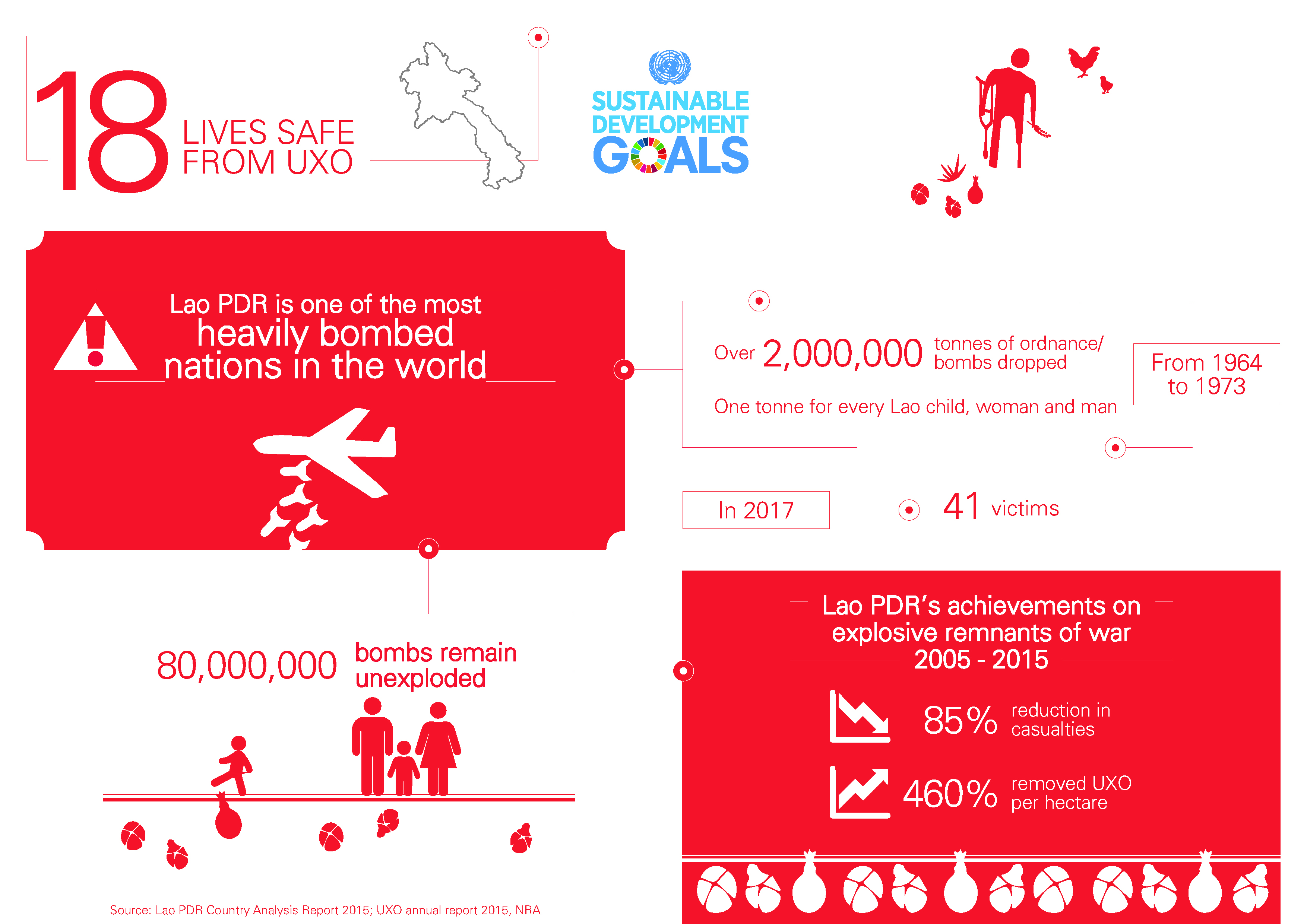 Sustainable Development Goal 18 (SDG 18) – ‘Lives safe from Unexploded Ordnance (UXO)’ aims to remove the UXO obstacle to human development in Lao PDR (Laos).1 SDG 18 was uniquely developed by Laos to address the more than 80 million cluster submunitions that remain unexploded throughout the country from the Second Indochina War.2 Cambodia also adopted an 18th SDG to address its own UXO crisis – Cambodia Mine/Explosive Remnants of War (ERWs) Free.’3 No existing SDGs address conflict or post-conflict issues, with SDG 11 — Sustainable cities and communities — and SDG 16 –Peace, justice, and strong institutions — being the most applicable to the UXO crisis.4